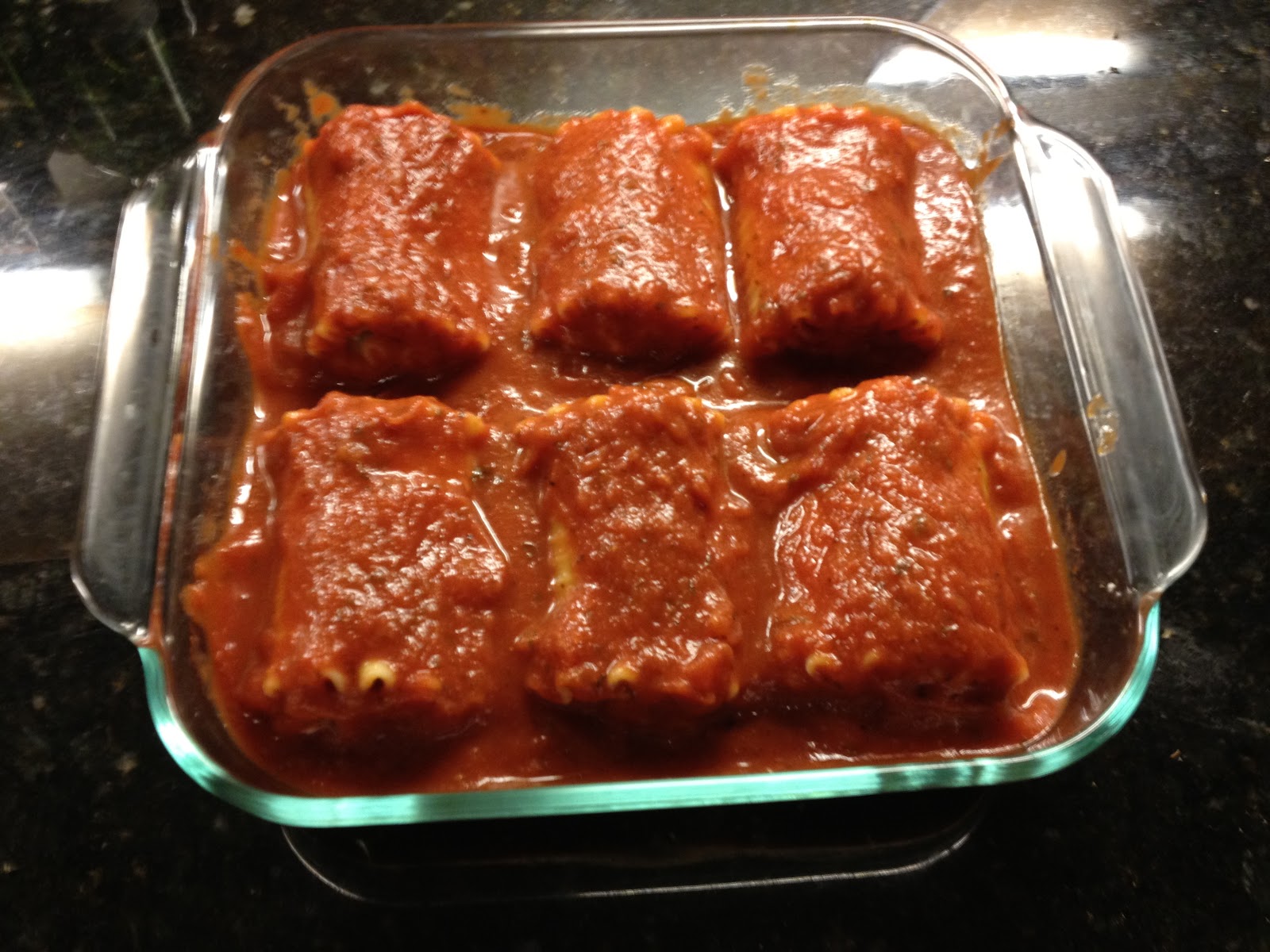 Spread 1/2 cup mixture on each lasagna noodle; roll jelly-roll fashion {I find that it is easier to just eyeball the mixture and divide it into six even looking portions}